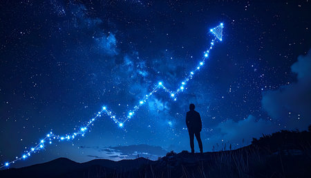 A lone figure stands silhouetted against a celestial backdrop, contemplating a glowing constellation that forms an upward-trending arrow. This is a powerful metaphor for innovation, investment strategy, and achieving ones goals.