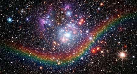Rainbow lens flare shining against a starry sky, creating a cosmic and mystical light effect