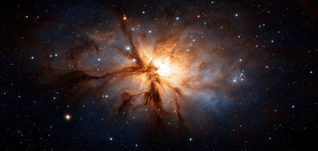 Vast cosmic panorama reveals a swirling nebula radiating warmth and light, surrounded by twinkling stars in the expansive universe.