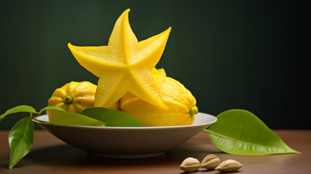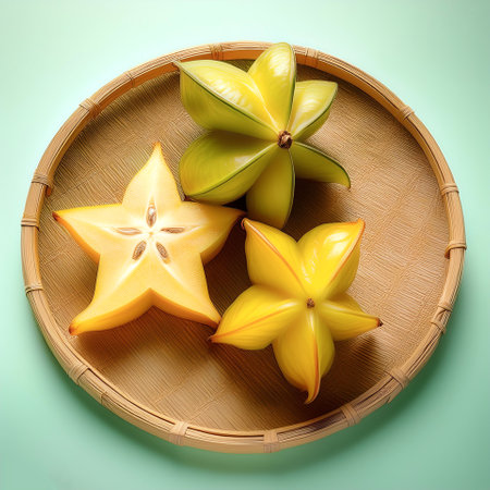 A vibrant display of fresh starfruit in a blue bowl, showcasing its unique star shape. This image captures the essence of tropical fruit and healthy eating.