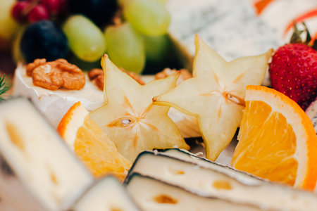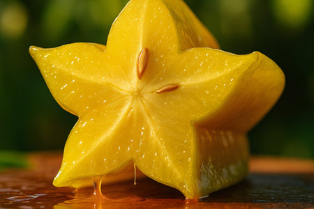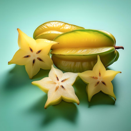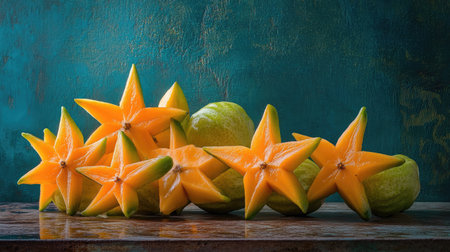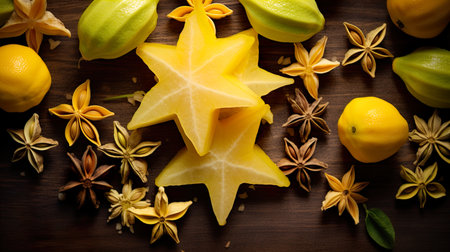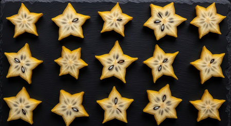 An artistic display of sliced starfruit arranged on a rustic wooden surface, showcasing vibrant colors and natural textures, perfect for food photography.