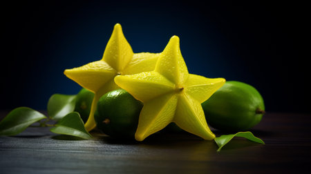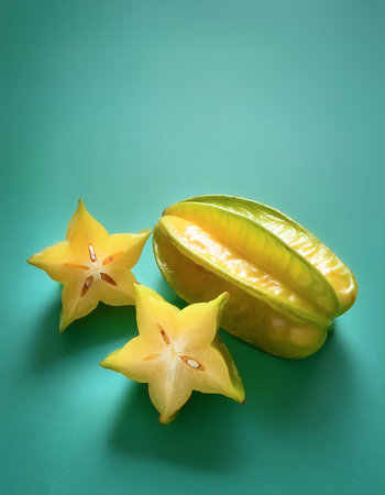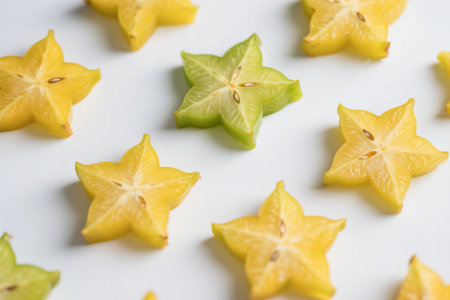 Starfruit, whole and halved, flat lay or top view, AI generative