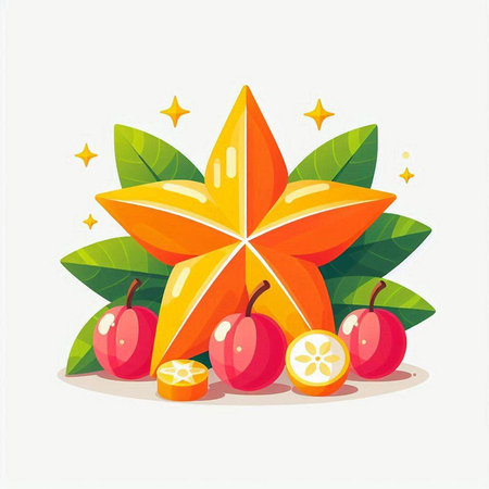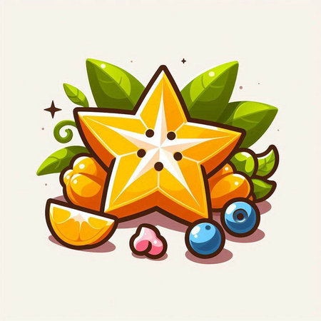 Star fruit with leaves and berries. Vector illustration. Cartoon style.