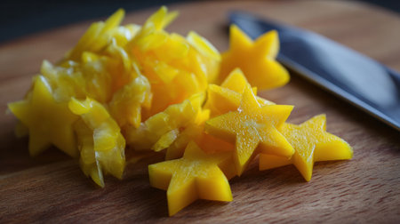 Sliced bright yellow peppers shaped like stars rest on a wooden cutting board, ideal for a childrens menu and perfect for creative meal ideas.