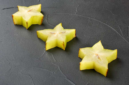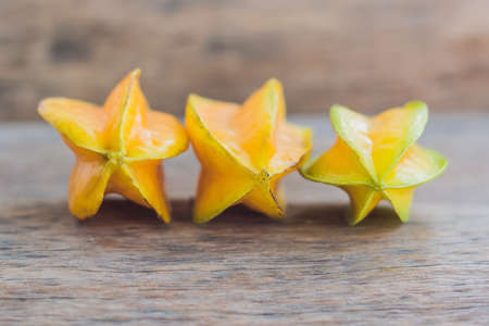 Star fruits on wooden table. Thai fruit : Star fruit is popular in asia, sweet taste fruits. Star fruits sliced on wood background. Selective focus.