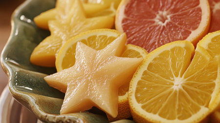 A vibrant assortment of freshly cut citrus fruits displayed on a decorative plate, featuring star-shaped melon slices for an eye-catching treat.
