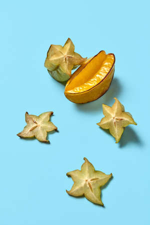 Ripe tropical fruit of a carambola sliced pieces presented on a blue background with copy space. Flat lay