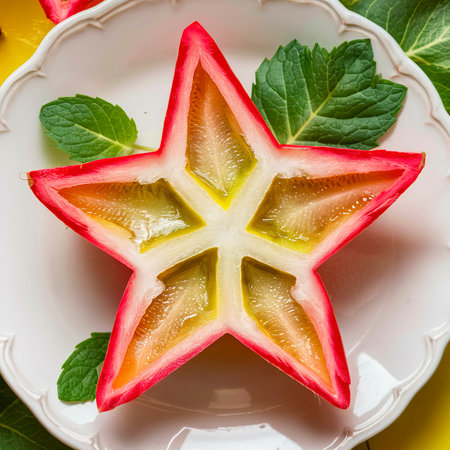 Vibrant starfruit slices arranged artistically on a dark surface, complemented by fresh greens. Perfect for food styling and culinary inspiration.