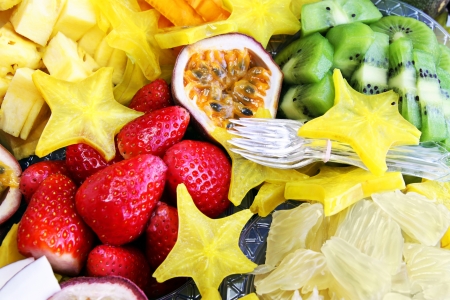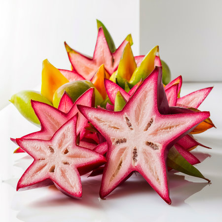A vibrant arrangement of various tropical fruits, featuring a beautifully sliced starfruit at the center, highlighting freshness and color, perfect for culinary use.