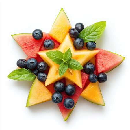 photo of a delightful star-shaped fruit salad with watermelon, cantaloupe, and blueberries, top-down view, isolated on white background, professional photography --ar 1:1 --v 6.1 Job ID: 72c08c7b-b844-48c3-a432-470f6b4a6a93
