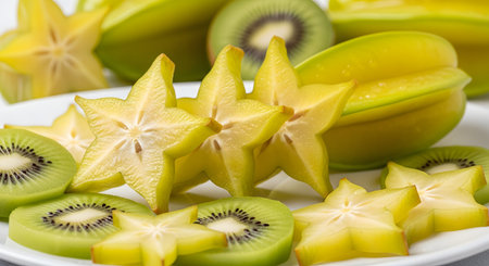 A close-up view of fresh, star-shaped yellow starfruit slices and green kiwi slices arranged on a white plate. This healthy tropical fruit platter highlights the juicy texture and vibrant colors of the vitamin-rich snacks.