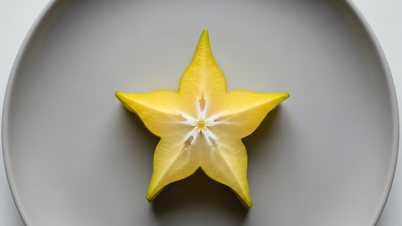 carambola fruit displayed in a minimalist set-up against a sleek polished concrete background, blending light gray and navy hues for a contemporary aesthetic. fresh fruit concept featuring star fruit with a modern twist in a stylish monochromatic arrangement. ai generated