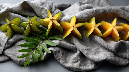 A visually appealing arrangement of fresh starfruit on soft gray fabric, enhanced by green leaves, perfect for culinary inspiration and healthy lifestyle promotion.