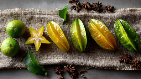 A visually appealing arrangement of fresh fruits including star fruit and limes, set against a burlap backdrop, showcasing vibrant colors and textures.