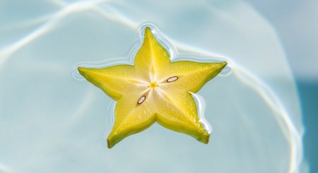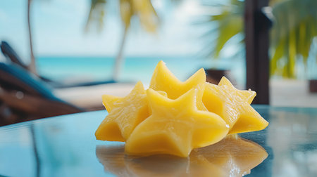 Delightful star-shaped yellow fruit displayed on a reflective table with a serene beach backdrop. Perfect for tropical-themed promotions or summer vibes.