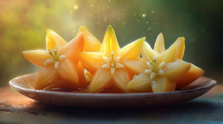 A beautiful arrangement of star-shaped yellow fruits on a wooden plate, showcasing their vibrant color and smooth texture against a soft, glowing background.