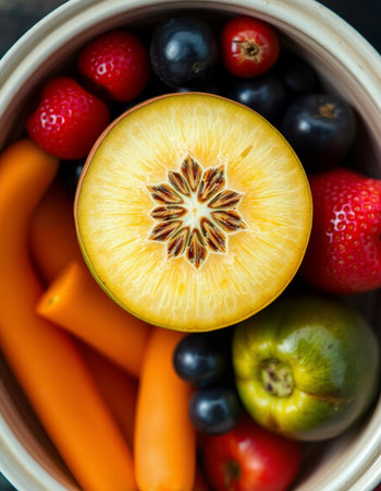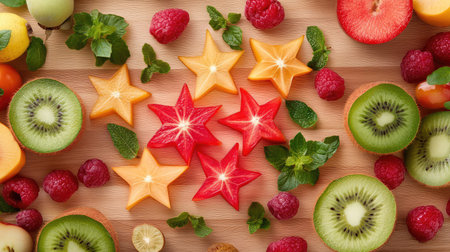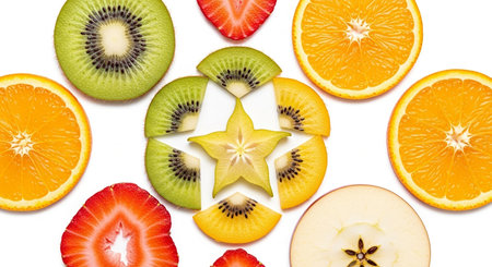 Explore a stunning assortment of fresh fruit slices arranged artfully, featuring yellow kiwi, green kiwi, star fruit, lemon, and red tomato, perfect for healthy lifestyle visuals.