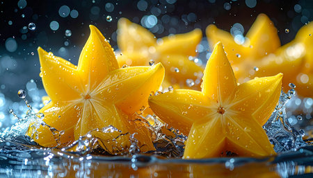 Two whole star fruits and one slice arranged on a wet orange surface, with water droplets and splashes creating a refreshing visual.