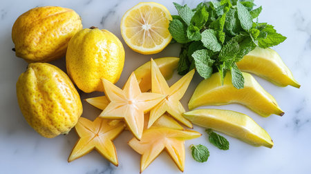 A colorful arrangement of fresh fruits including star fruit, lemon, and mint on a marble surface, perfect for summer dishes or healthy recipes.