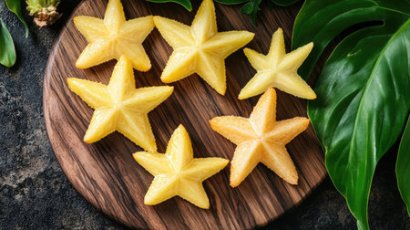 A vibrant display of fresh starfruit slices on a rustic wooden board, complemented by green leaves. Perfect for food photography or tropical themes.