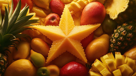 A vivid collection of fresh fruits including pineapple, mango, orange, and star-shaped slices creates a visually stunning and colorful arrangement, perfect for promoting healthy eating.