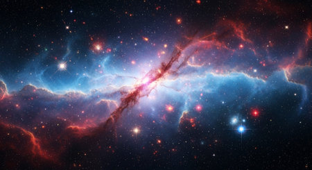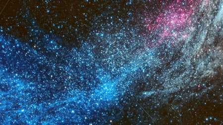 A cosmic background with vibrant stars and galaxies, perfect for creating an enchanting space-themed design or backdrop. The colors include shades of blue, purple, and red, creating a mesmerizing effect that would be great as a digital banner. This is an ultra-realistic photograph captured using a high-resolution 70mm film camera. --ar 79:30 --v 6.1 Job ID: 427a4a0e-4f14-4f4e-aa43-c1ffd2821092