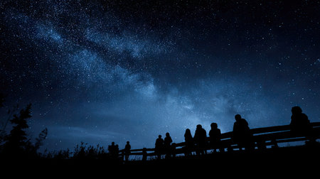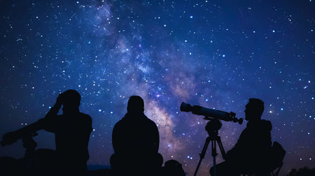 A family is observed looking up at the night sky. The image showcases the Milky Way and countless stars, with a telescope. The composition offers a view, with a dark foreground. The image has potential uses for educational or commercial purposes, such as illustrating concepts of astronomy.