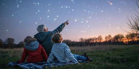 Grandfather showing grandchildren constellations under starry sky