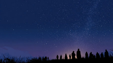 Concept photo of pilgrims gazing at the stars in a clear night sky, feeling a sense of wonder and awe at the vastness and mystery of the universe, and their place within it