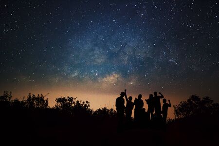 Landscape with milky way, Night sky with stars and silhouette of happy people standing on the mountain, Long exposure photograph, with grain