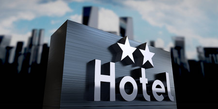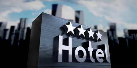 Metallic glass hotel sign board with five golden stars, text and skyscrapers as background.