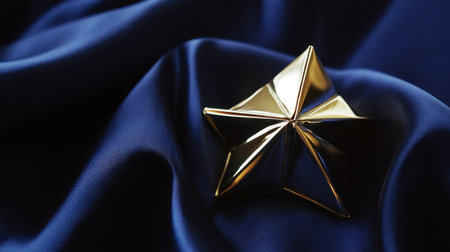 This captivating image showcases a polished golden star sculpture resting on luxurious blue satin fabric, perfect for themes of elegance and sophistication.