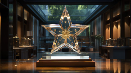 A close-up shot of a golden star trophy on a reflective surface, with golden confetti falling around it, symbolizing achievement and celebration.