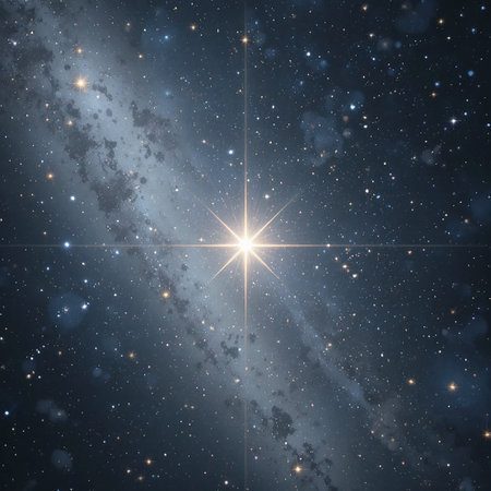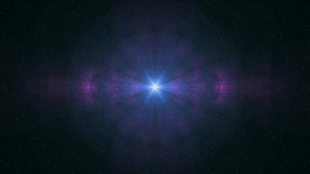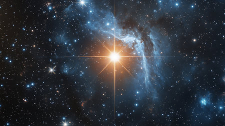 A bright star with a distinct lens flare shines in the center of a dark galaxy filled with nebulae and numerous stars.