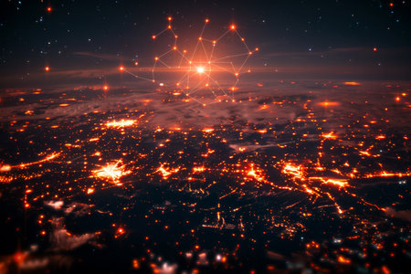 Connected lights above illuminated earth's surface in the night, AI Generated