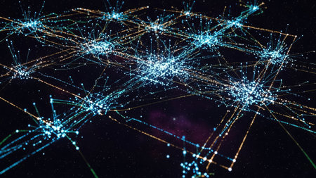 An abstract graphic presents a network of connected nodes, illuminated by vibrant blue and yellow lines against a dark background. The image features a composition with dynamic lines, suggestive of data flow or communication. This visual could be used for illustrating technology, data science, or as a backdrop for various creative applications.