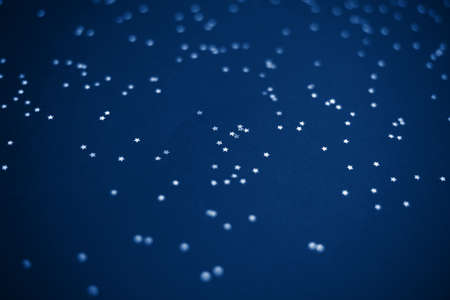 Glowing mica Silver stars confetti on blue color trendy background. Holiday confetti. Classic Flat lay. New Year 2020. Color of the year. Festive holiday confetti. Celebration concept.