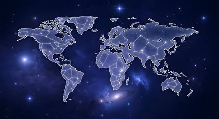 A vibrant digital network graphic representing global connectivity on a starry purple background