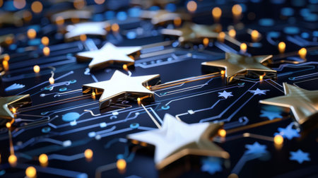 This captivating image features golden stars scattered across a dark blue circuit board background, interspersed with glowing lights, creating a mesmerizing futuristic atmosphere.