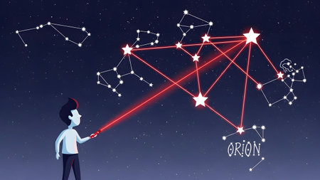 Boy uses a laser pointer to connect stars in the Orion constellation in the night sky.