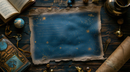 Explore a mystical antique star map laid on a wooden table surrounded by old books, globes, and tools. Perfect for themes of exploration, history, and astronomy.