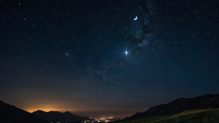 Night sky with stars and the moon over the mountains. View from the top of the mountain.