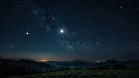 A deep blue night sky is densely packed with countless tiny stars and a few larger, brighter celestial bodies.