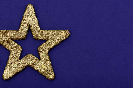 Golden glittering star Christmas ornament isolated on a blue background