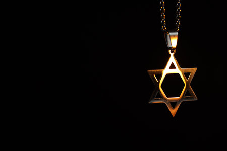 Holocaust Remembrance Day. Pendant in shape of Star of David against black background, closeup. Space for text