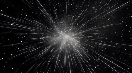 An abstract illustration presents a starfield with numerous radiating light streaks. The composition features a symmetrical arrangement of lines and points of light, in shades of blue and orange against a dark backdrop. This imagery suggests themes of movement, energy, and cosmic expanse, suited for various creative and design applications.