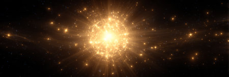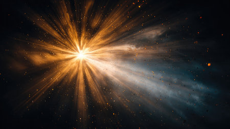 This captivating image showcases a dynamic explosion of golden light in cosmic space, featuring sparkling particles and radiating energy trails, evoking a sense of awe and wonder.