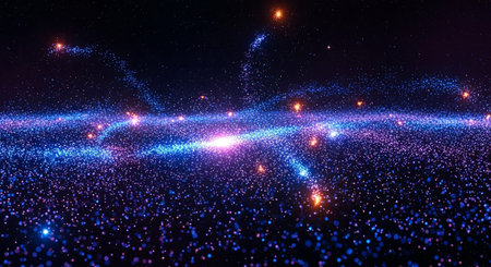 Sparkling silver dots and luminous particles surge outward from the center, creating a captivating explosion of energy in a dark setting, evoking movement and vibrancy.