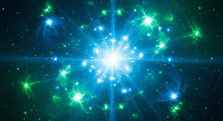 This mesmerizing image depicts an explosive burst of light within a cosmic space, featuring vibrant colors, radiant stars, and dynamic energy flows that inspire creativity and wonder.