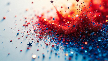 Dazzling explosion of light radiates outward, creating mesmerizing display of shimmering particles against dark background. This captivating visual evokes feelings of wonder and excitement